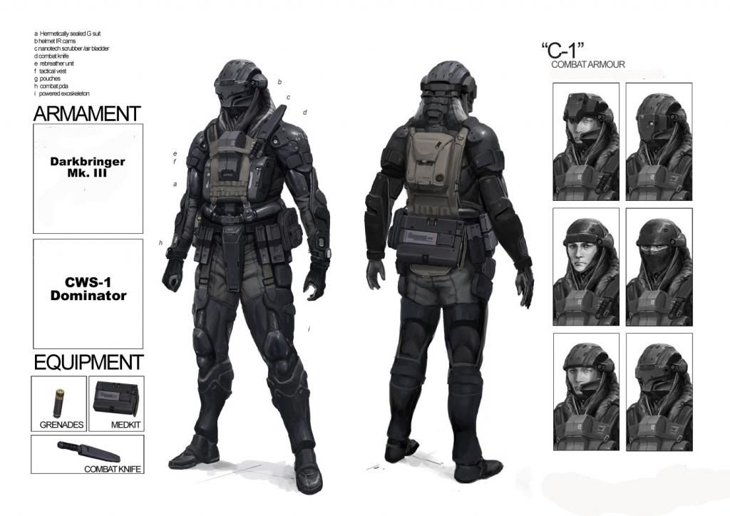 Designation- C-1 Combat Armor Usage- Standard Iron Guard issue Primary Weapon Issue- Darkbringer Mk. III Secondary Weapon Issue- CWS-1 Dominator Additional Equipment- - Vibroblade (combat knife)