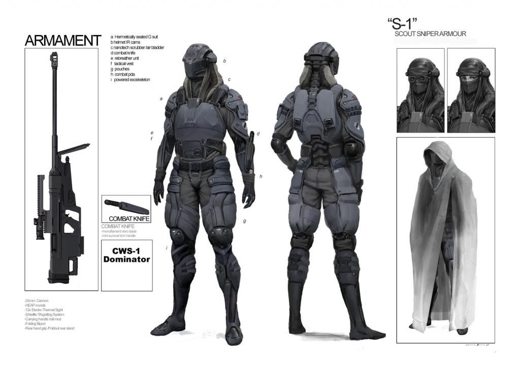 Designation- S-1 Scout/Sniper Armor Usage- Specified individuals with aptitude and training for long-range elimination Primary Weapon Issue- - Eliminator Mk. II